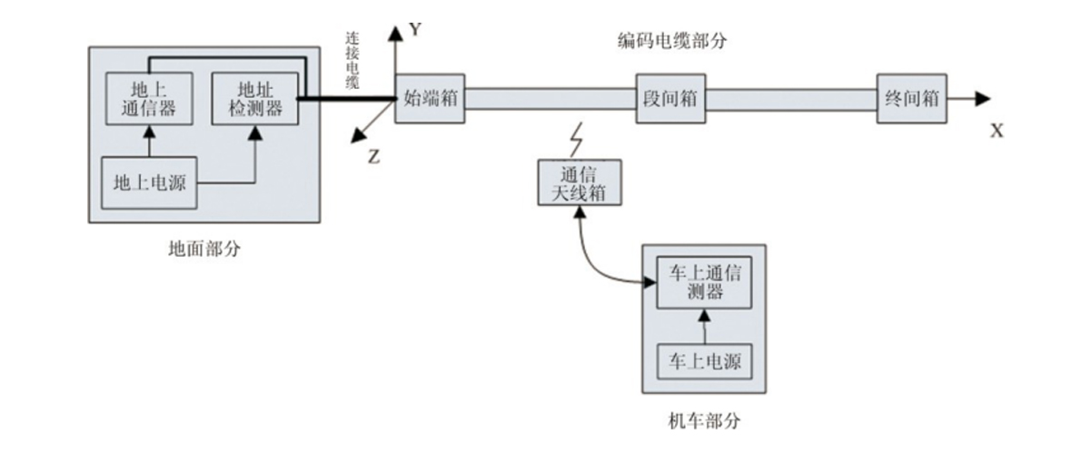 地上位置檢測(cè)與通信系統(tǒng)是利用電磁感應(yīng)原理來(lái)實(shí)現(xiàn)位置檢測(cè)和數(shù)據(jù)通信的。它由地面部分、編碼電纜部分、車上部分組成。其中地面部分由地上通信器、地址檢測(cè)器、地上電源組成;編碼電纜部分由始端箱、編碼電纜、段間箱、終端箱組成;車上部分由車上電源、車上通信器、天線箱組成。