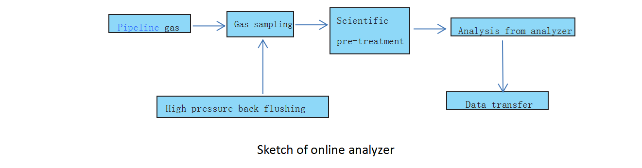 This series of products can be defined as integrated products software and hardware , involving online analysis fields such as coal-fired flue gas and coke oven gas, including sampling methods for online analysis systems, pretreatment processes, gas analyzers, and software and hardware systems for industrial control. During the development of this series of products, the relevant field gas parameters and operating conditions, installation locations, and climatic conditions were collected to enable a fully customized design. The system workflow is as follows: